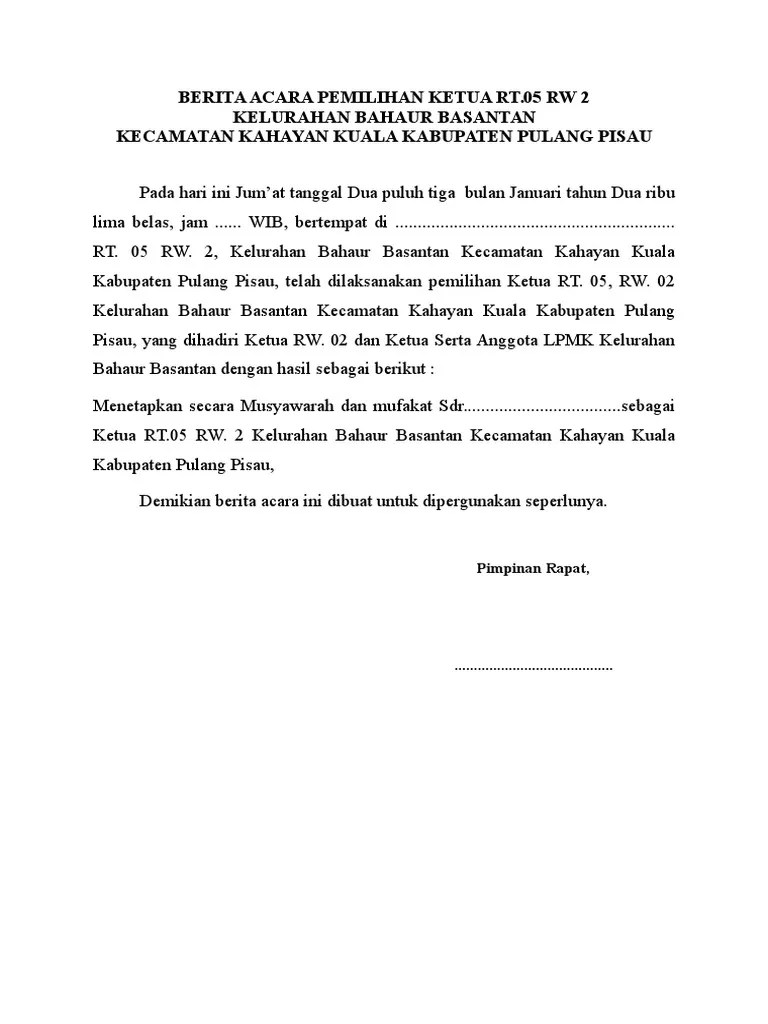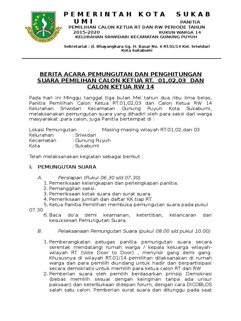 Berita acara pelaksanaan pemilihan ketua rt. Contoh surat pengunduran diri rt. Surat suara yang diterima dari panitia pemilihan (termasuk cadangan), 60. Contoh format berita acara pemilihan ketua rt dan rw. Berita acara pemilihan ketua rt.